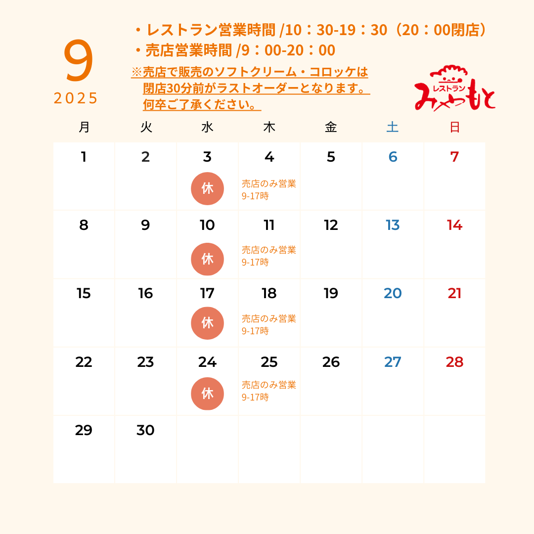 9月のレストランみやもとの営業日カレンダーです。