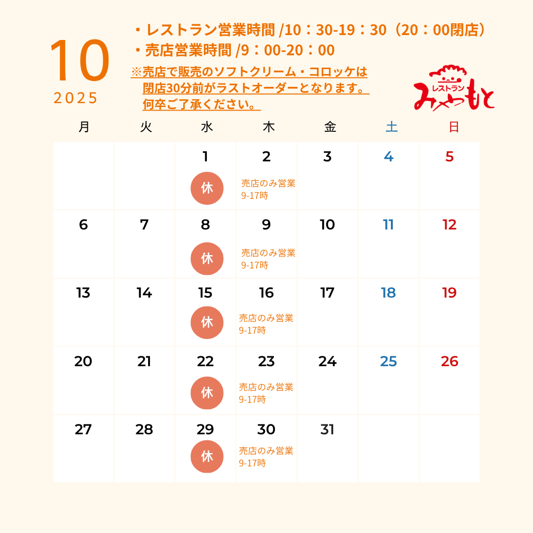 10月のレストランみやもとの営業日カレンダーです。