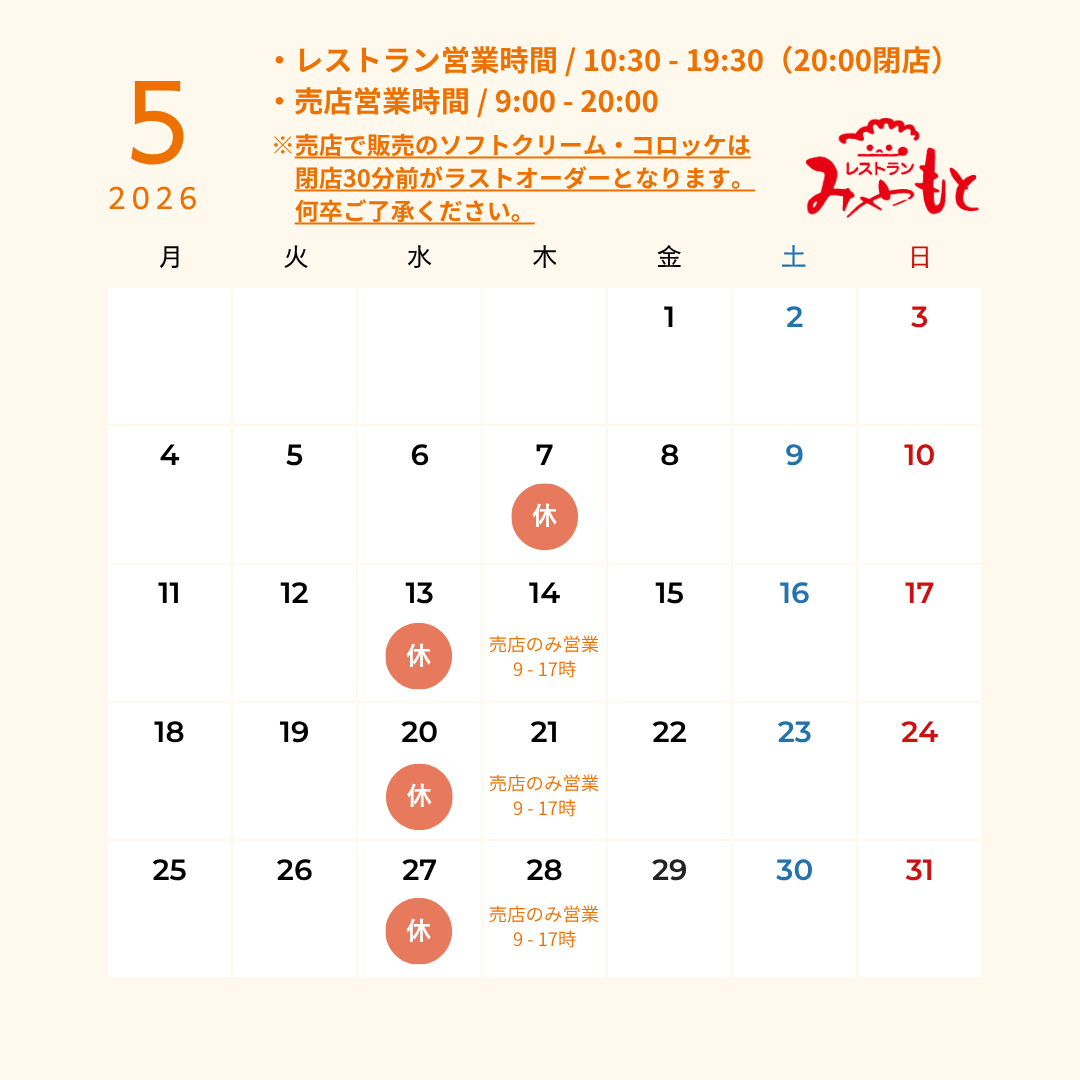 7日は休業、翌週以降の木曜日(14日・21日・28日)は売店のみ営業(9時〜17時まで/ソフトクリーム・コロッケのテイクアウトは16時半まで)致します。